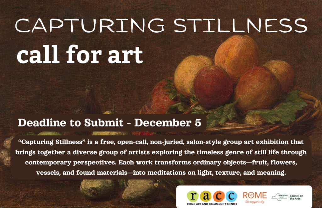 “Capturing Stillness” is a free, open-call, non-juried, salon-style group art exhibition that brings together a diverse group of artists exploring the timeless genre of still life through contemporary perspectives. Each work transforms ordinary objects—fruit, flowers, vessels, and found materials—into meditations on light, texture, and meaning.