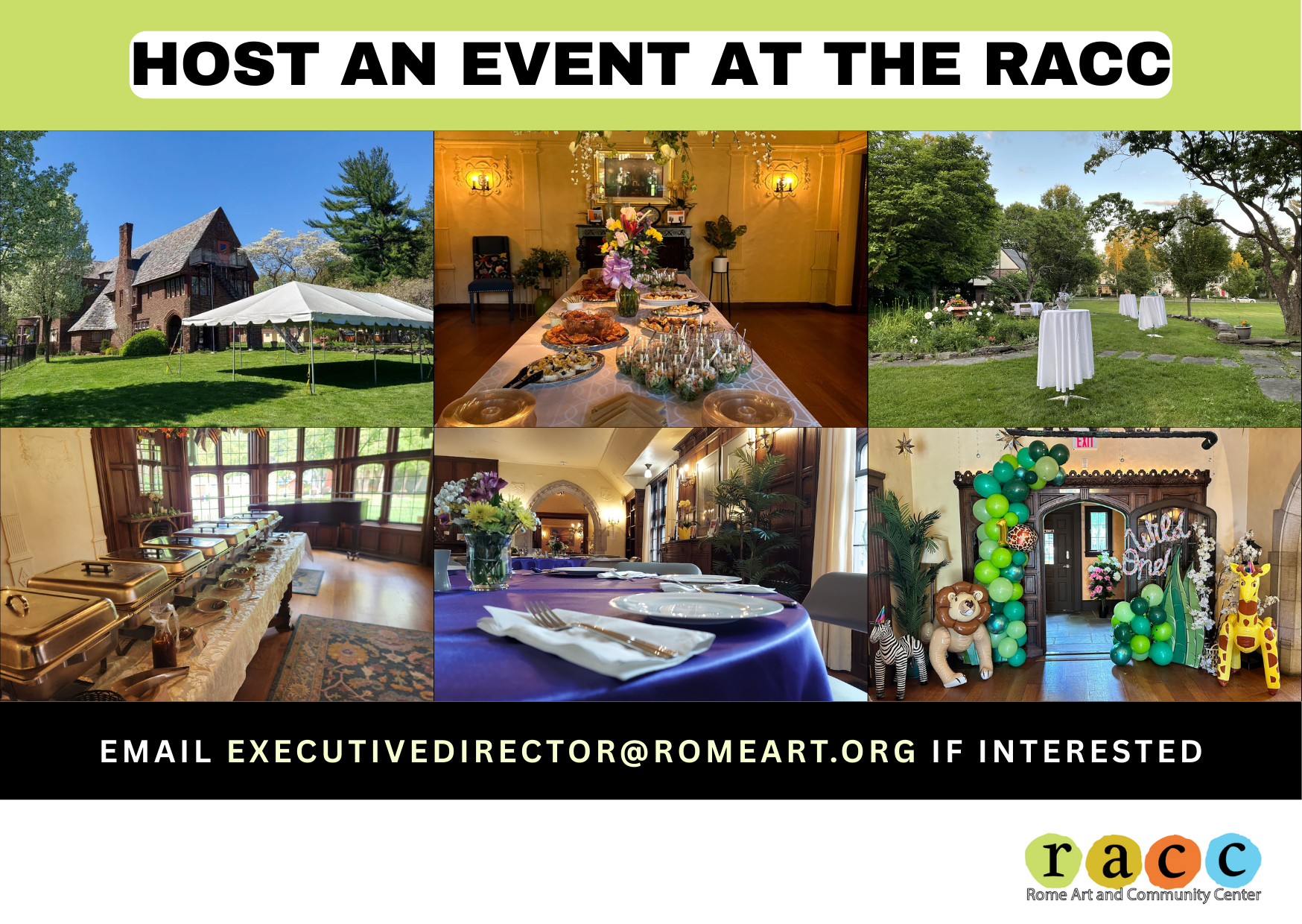 Take a moment to view photos of past events and discover how the Rome Art and Community Center can bring your vision to life.
